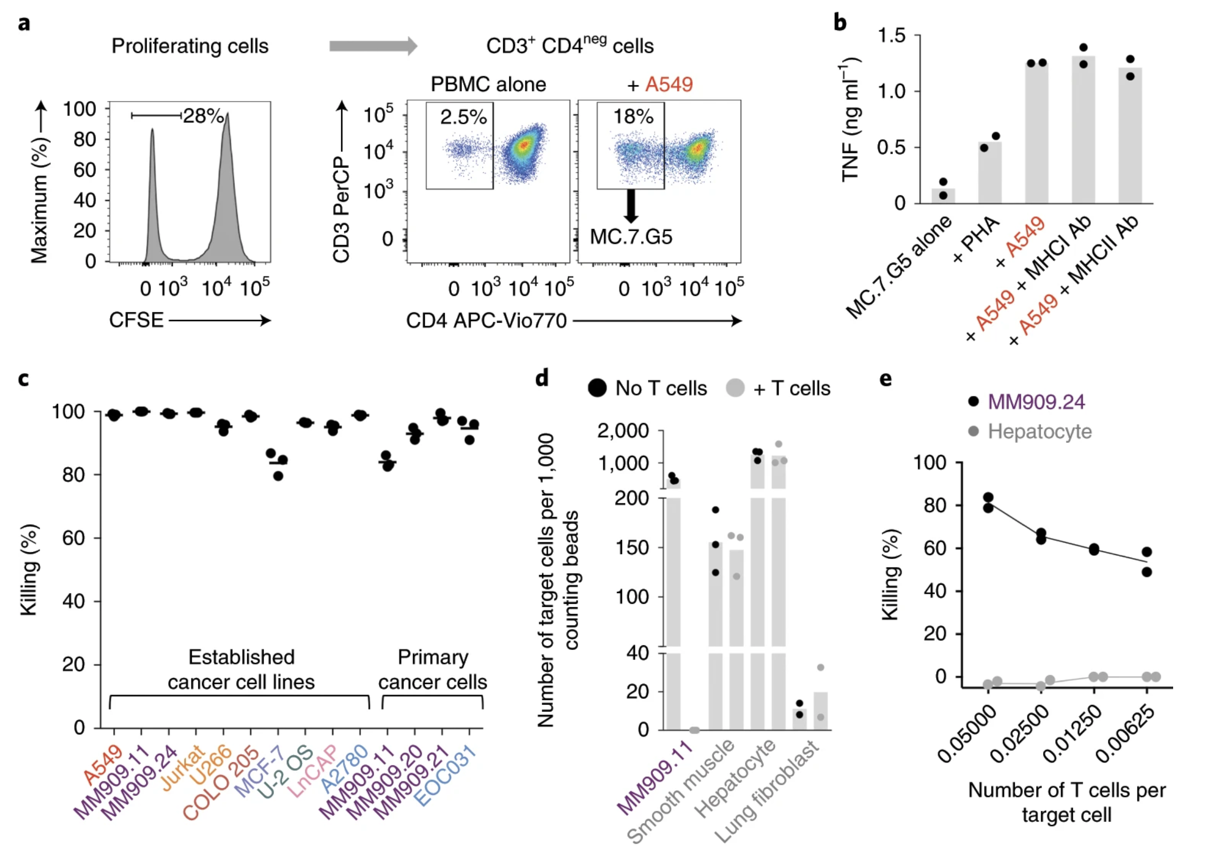 Fig. 1: MC.7.G5 recognizes multiple cancer types through an HLA-independent mechanism.