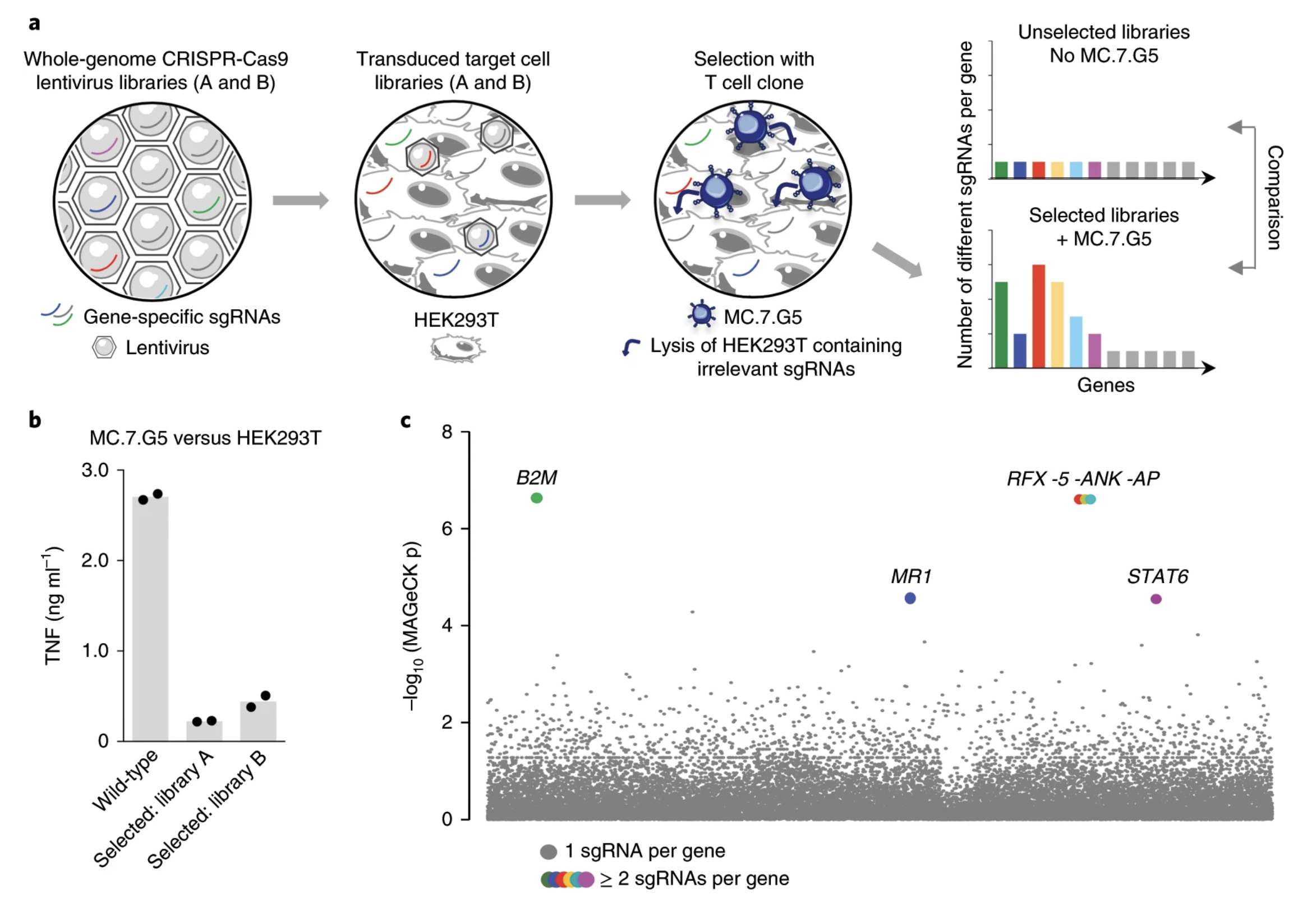 Fig. 2: Whole-genome CRISPR–Cas9 library screening reveals MR1 as the candidate target of MC.7.G5.