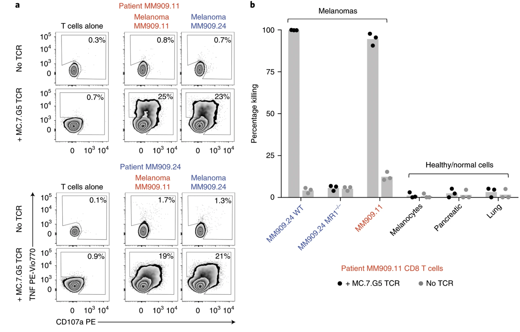 Fig. 8: Transfer of the MC.7.G5 T cell receptor redirects patient T cells to recognize autologous melanoma.